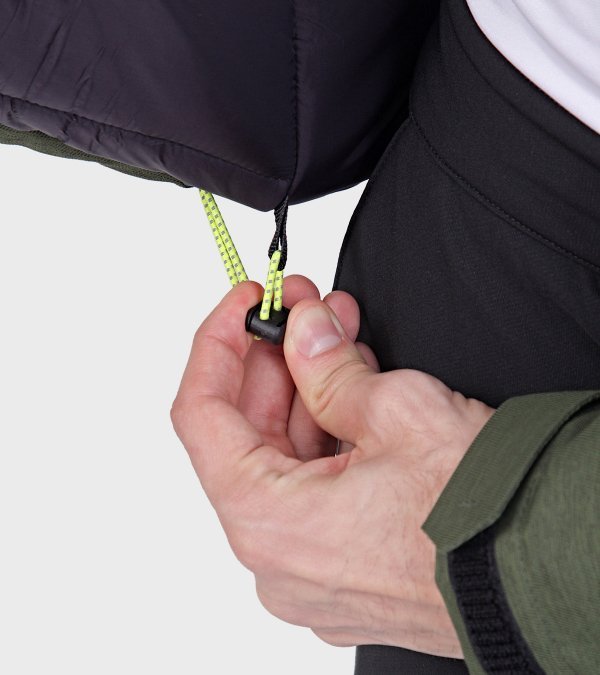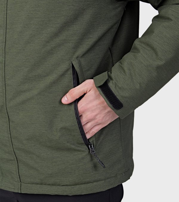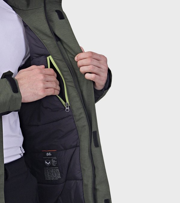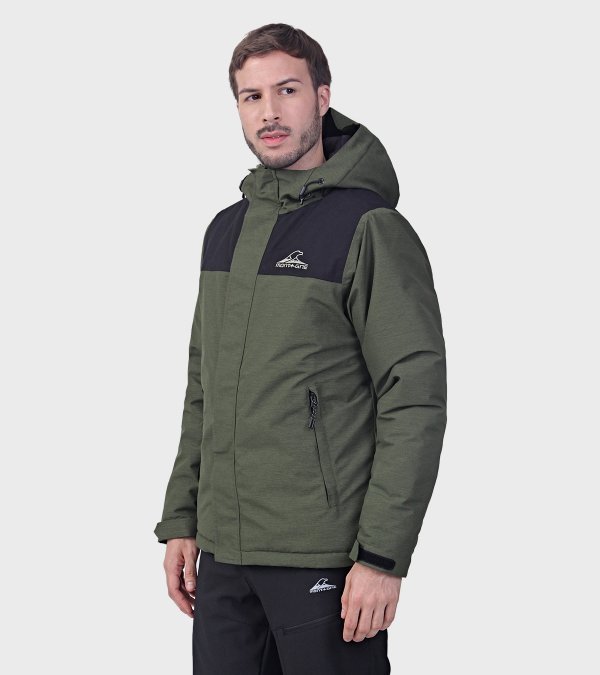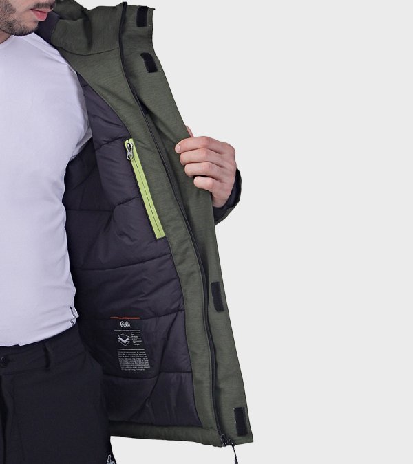 **PROPIEDADES DE LA PRENDA**: • Confeccionada con un tejido altamente resistente a la abrasión y a la rotura. • Es altamente impermeable. • Es una prenda de alto rango térmico y sus costuras principales están termoselladas. • Posee un tratamiento de repelencia al agua, que dificulta que el tejido la absorba favoreciendo las propiedades de impermeabilidad y antimanchas. • No requiere el uso de plancha. • Para mantener el aspecto original de la prenda por más tiempo, se recomienda evitar el contacto prolongado con superficies abrasivas, que puedan dañar la superficie el tejido. **TELA**: Sarga Melange. Tejido bicapa con elasticidad mecánica, membrana impermeable/respirable y con muy buena repelencia al agua. EXTERIOR: Poliéster 100%. MEMBRANA: Poliuretano 100% **TELA INTERIOR**: Cirée matelassé lining. Poliamida 100%. Tafeta ciree 210T. Poliester 100% **RELLENO**: Eco Down. Microfibra hueca de alta retención térmica. Ultraliviana. Poliéster 100% **DESCRIPCIÓN:** - Capucha fija con dos puntos de ajuste - Tapacierre con velcro - Bolsillos laterales con cierre - Puños con regulacion por velcro - Regulacion interna en ruedo, por cordon elastico y tanca - Bolsillo interno - Costuras principales termoselladas